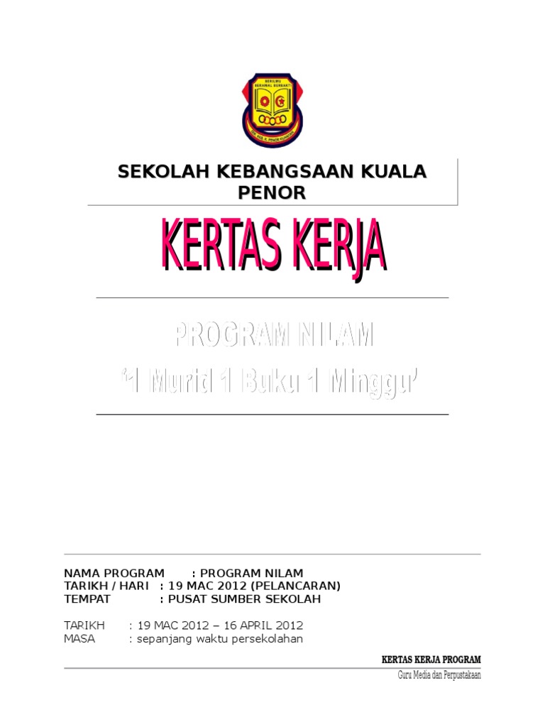 View kertas kerja pelancaran nilamdoc from ENGLISH MISC at Malaysia University of Science Technology. SEKOLAH KEBANGSAAN SUNGAI TUKANG SIDIN 36750 CHIKUS PERAK KERTAS KERJA CADANGAN KEMPEN BANYAK MEMBACA NILAM FEB 2012 hingga. 1230 0130 ptg-Taklimat Biasiswa Baitulmal.